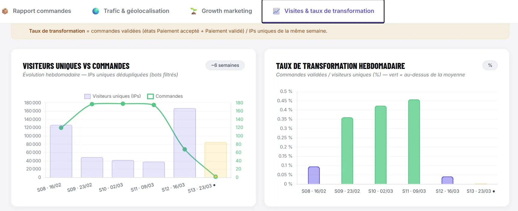 Vision unifiée de vos performances d'acquisition : SEO, SEA, Social Ads, emailing, affiliation. Croisement des données de trafic, de conversion et de chiffre d'affaires pour identifier les leviers réellement rentables.