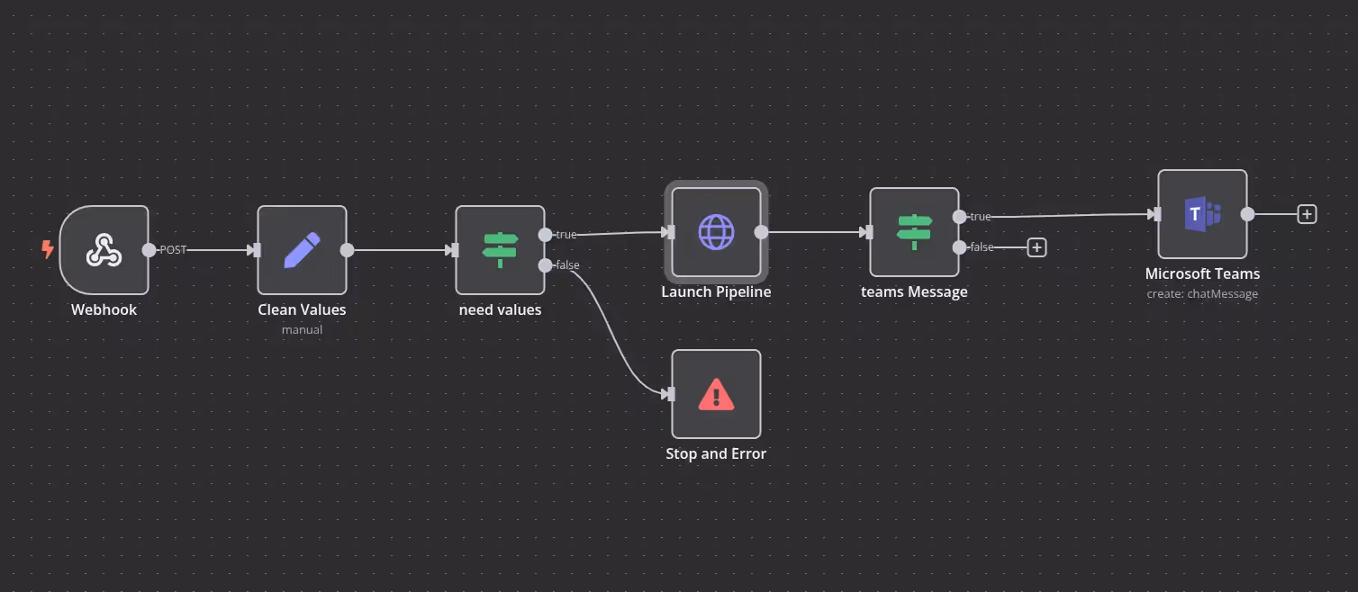 Dans notre cas d’exemple nous renseignons les champs pour publier un message sur Teams ainsi que les caractéristiques de notre pipeline.