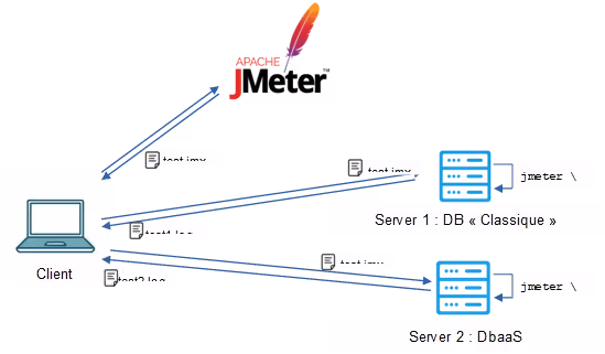 Or dans notre cas d’usage, où l’on souhaite mesurer précisément la différence de performance entre la base de données« classique » et la base de données DbaaS, exécuter les tests sur une machine pourrait manquer de précision de par la dimension réseau. Si pendant un des tests le réseau se voyait encombré, on pourrait voir une différence de performance totalement étrangère à la base de données.