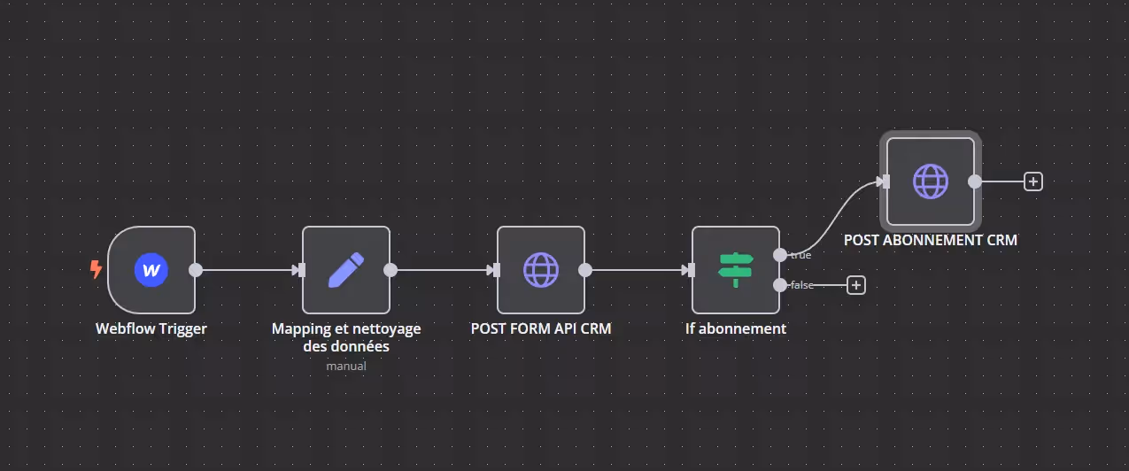 Si vous cherchez plus de flexibilité pour transformer finement les données, bénéficier d’une excellente gestion anti-spam et pouvoir faire évoluer votre workflow vers d’autres outils, alors l’intégration via un webhook n8n est la meilleure approche. Cette option offre le meilleur des deux mondes : design et captcha natifs Webflow + puissance et personnalisation de HubSpot via son API.