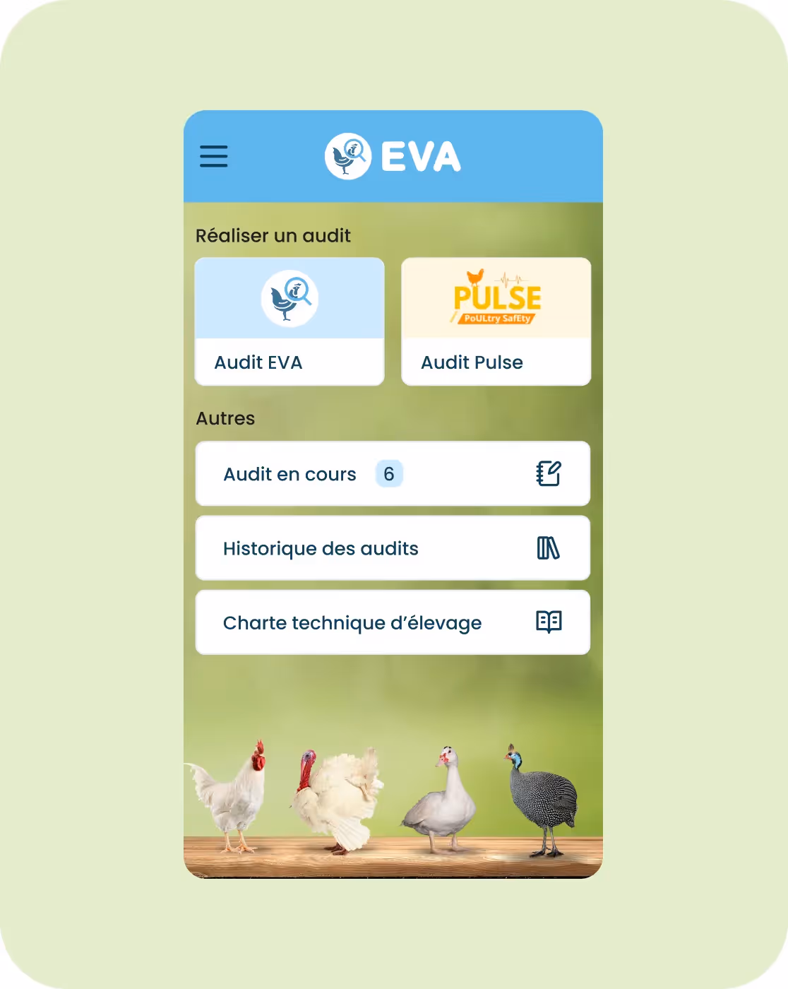 EVA, évaluation des élevages de volailles, est un ensemble de briques techniques proposant une solution complète allant de la saisie d'audit en élevage grâce aux applications mobiles à un site de gestion complet.
