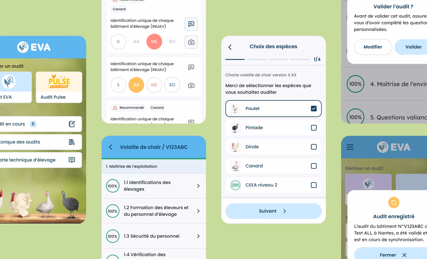 Partie emmergée de l'iceberg, l'application EVA permet aux utilisateurs d'une centaine d'organismes de certification de sélectionner une ou plusieurs espèces de volailles permettant de constituer une grille de questions personnalisées. Lors de son audit de l'exploitation, l'utilisateur, accompagné de l'exploitant, rempli le questionnaire au moyen d'une interface très simple, adapté aux conditions parfois compliqué d'audit. A l'issue du parcours, une note de conformité est délivrée, l'auditeur et l'exploitant signent l'audit, qui peut alors être traité et enregistré sur la base de données centralisée : un mail de recapitulatif est alors envoyé, un PDF de synthèse y est joint.