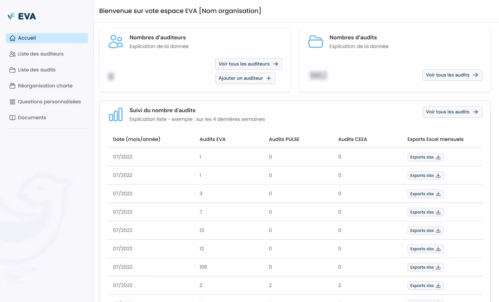 Principal composant de la solution, le backoffice EVA propose aux 4 grandes familles d'utilisateurs (administrateurs, gestionnaires, auditeurs, éleveurs) des fonctionnalités qui leurs sont propres, allant, notamment, de la gestion des ensembles de questions disponibles dans les applications, la création d'organisations ou d'utilisateurs, à des interfaces de suivi statistiques ou d'export des audits réalisés.