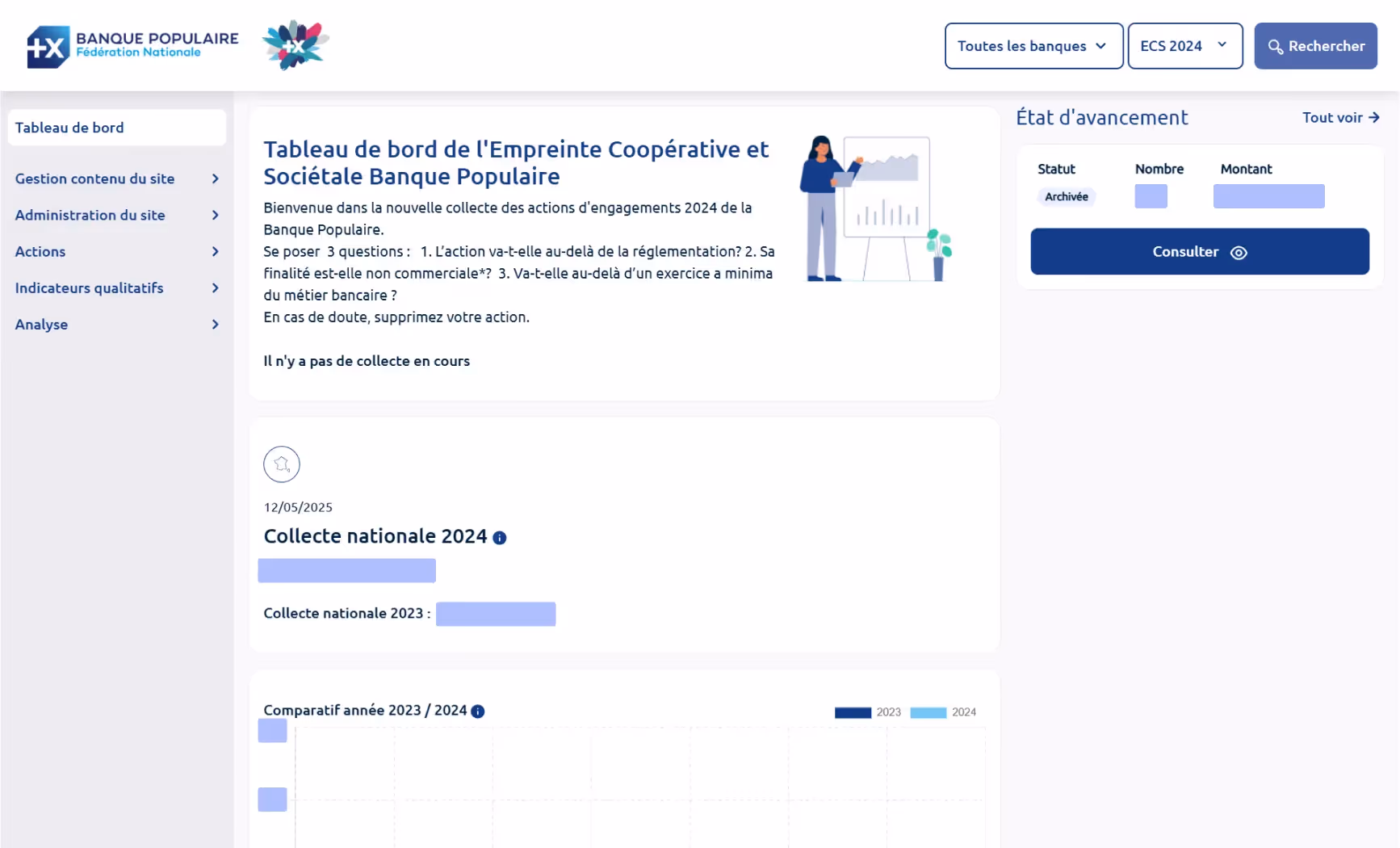 La refonte s’estarticulée en trois phases clés. D’abord, une conceptionUX-UI mobilisant les pilotes RSE des banques régionales, avec une attention particulière portée à la fluidité de saisie et à la réplicabilité des actions entre entités. L’objectif : dépasser les limites de l’ancien outil et concevoir des parcours simplifiés. Ensuite, la production technique de la plateforme, avec comme enjeu fort la reprise de l’historique des données dans un socle Symfony robuste et sécurisé. Enfin, une phase d’évolutions, nourrie par les retours des utilisateurs lors des tests et de la mise en production, permettant d’intégrer progressivement de nouvelles fonctionnalités à forte valeur ajoutée.Chaque étape a été pensée en co-construction, pour garantir l’adhésion et la pertinence du dispositif.