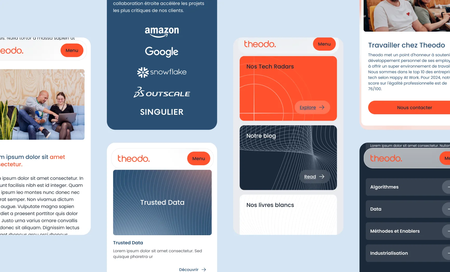 En collaboration avec l'équipe design de Theodo, Digital Garden a conçu des maquettes UX/UI et des gabarits de pages pensés pour valoriser les expertises de Theodo, faciliter la lecture des contenus et guider les utilisateurs vers les points de contact clés tout en appliquant la direction artistique de Theodo. La hiérarchisation de l’information, la lisibilité et la cohérence des parcours ont été travaillées dès la conception, avec une attention particulière portée à la performance, à l’accessibilité et à l’efficacité des call-to-action.