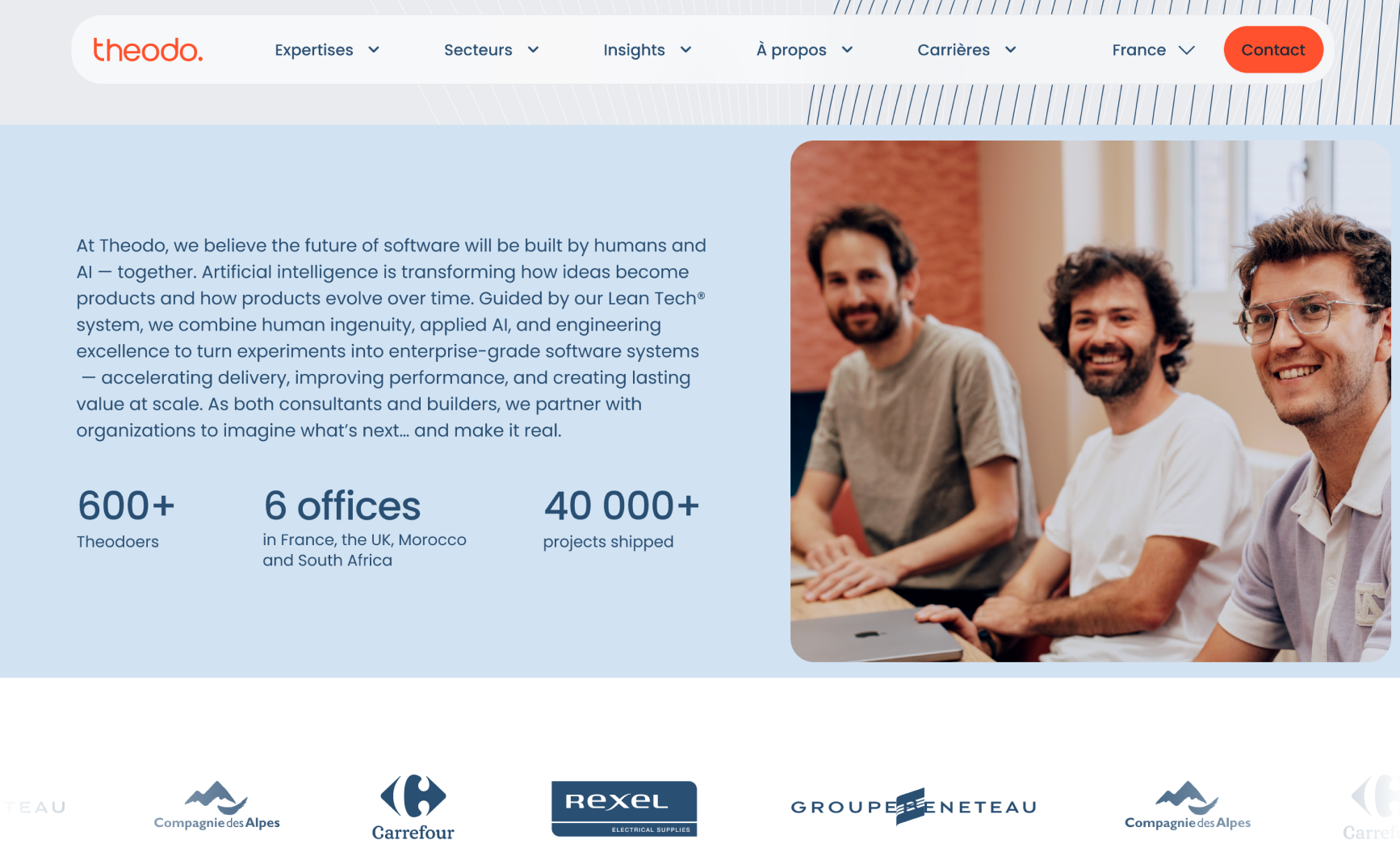 Theodo a engagé la refonte complète de son site corporate dans un contexte de transformation stratégique : simplification de l’architecture de marque, fusion de plusieurs sites existants (France, UK, US, Maroc, anciennes entités et blogs actifs) avec l'ambition de faire du nouveau site theodo.com un véritable levier de génération de leads.